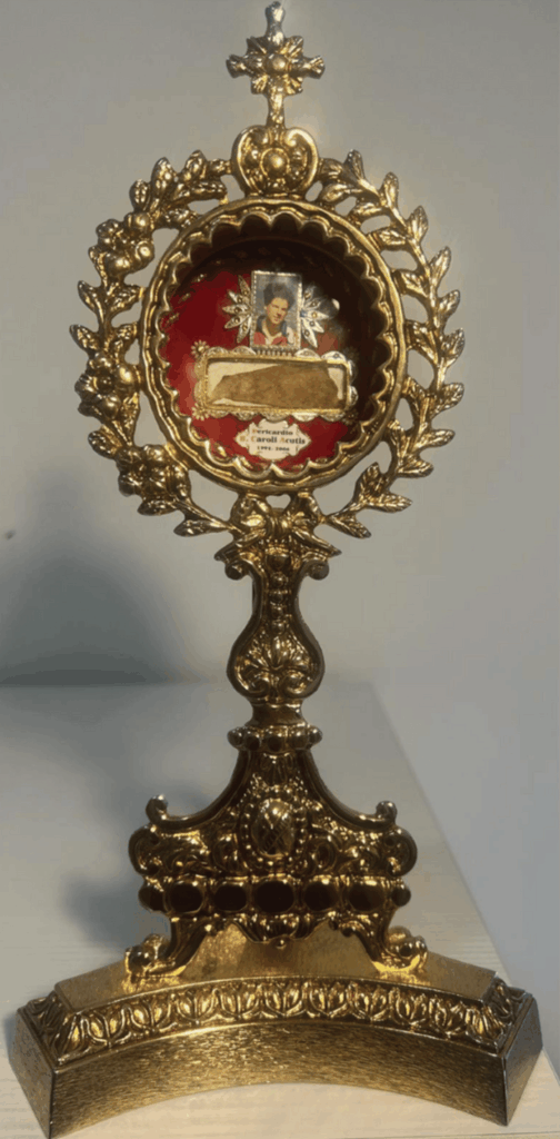 The First Class pilgrim relic is 6 cm in length and 2 cm high, and preserved in a reliquary 33 cm high and 17 cm wide, and is carried worldwide by the Diocese of Assisi, as custodian of the relics of Carlo Acutis, and respecting Church guidelines.